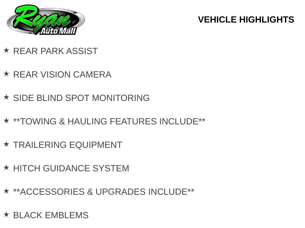 Comfort and convenience features include a power driver’s seat, heated front seats, a power liftgate, rear window defroster, remote start, and a universal garage door controller. Safety and driver assist technologies include lane change alert, rear cross traffic detection, rear park assist, and side blind spot monitoring, providing peace of mind for every drive. Towing and hauling needs are supported with trailering equipment and a hitch guidance system, while exterior upgrades such as black emblems, deep tinted glass, splash guards, wheel locks, and 18-inch bright silver aluminum wheels enhance both style and functionality.