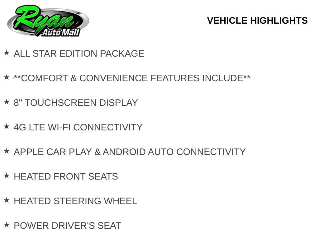 This model comes equipped with the All Star Edition Package, providing premium comfort and technology upgrades. Inside the cabin, you’ll find an 8-inch touchscreen display with Apple CarPlay and Android Auto integration, 4G LTE Wi-Fi connectivity, and a universal garage door controller. Heated front seats, a heated steering wheel, a power driver’s seat, dual-zone automatic climate control, and a power sliding rear window enhance daily driving comfort. Additional features such as a 120-volt outlet inside and a 120-volt cargo bed outlet provide added versatility for work or leisure. Remote start, rear window defroster, and keyless entry with push button start ensure convenience in every season.