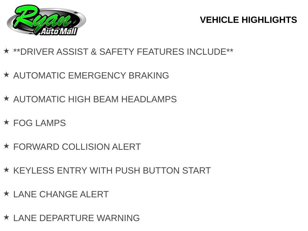 Safety and driver assistance features include automatic emergency braking, forward collision alert, lane keep assist, lane departure warning, blind spot monitoring, rear cross traffic detection, and a rear vision camera, helping provide added confidence behind the wheel.
